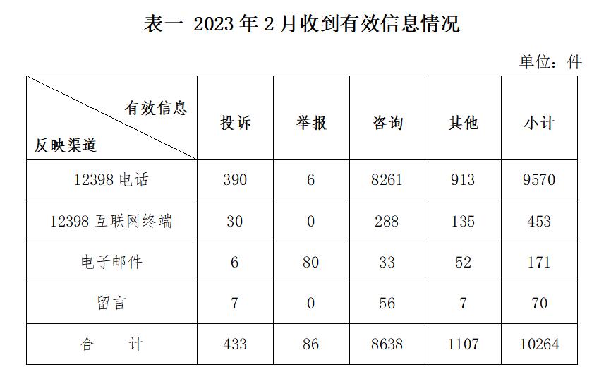 2023年2月,國家能源局12398能源監(jiān)管熱線(以下簡稱12398熱線)共收到有效信息10264件(包含投訴、舉報(bào)、咨詢和其他訴求類別),環(huán)比減少27.07%,同比增加22.69%。(2023年2月收到有效信息情況見表一)