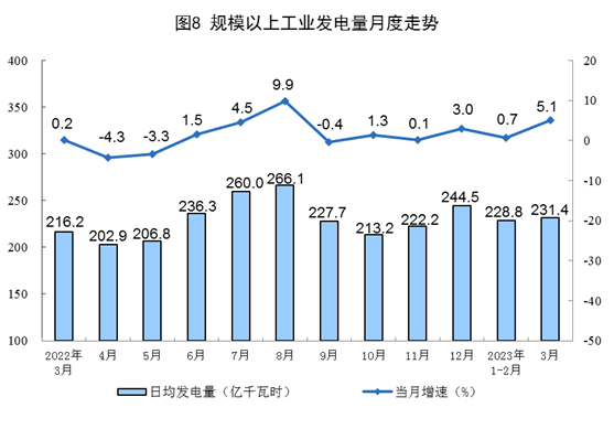 電力生產增速加快。3月份,發(fā)電7173億千瓦時,同比增長5.1%,增速比1—2月份加快4.4個百分點,日均發(fā)電231.4億千瓦時。1—3月份,發(fā)電20712億千瓦時,同比增長2.4%。