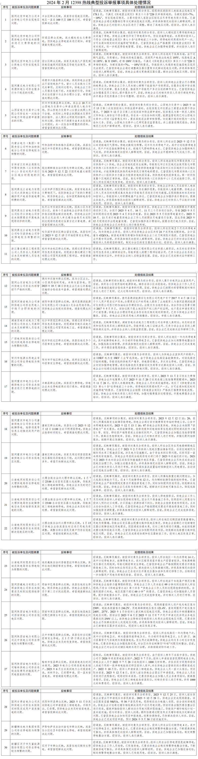 2024年2月,國家能源局12398能源監(jiān)管熱線(以下簡稱12398熱線)共接收投訴舉報432件,辦結(jié)投訴舉報526件(含往期結(jié)轉(zhuǎn))?,F(xiàn)將有關(guān)情況通報如下: