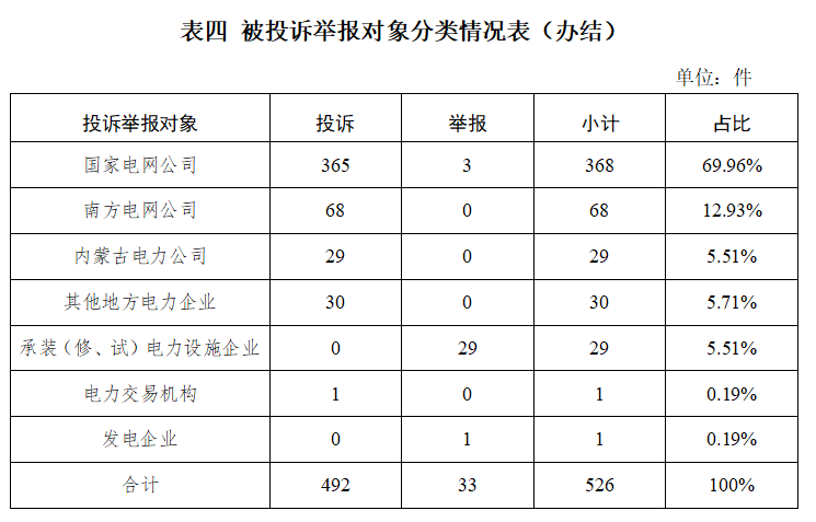 從被投訴舉報對象看,供電企業(yè)495件、占投訴舉報總數(shù)的94.10%,其中國家電網(wǎng)公司368件,占比69.96%;南方電網(wǎng)公司68件,占比12.93%;內(nèi)蒙古電力公司29件,占比5.51%;其他地方電力企業(yè)30件,占比5.71%;承裝(修、試)電力設(shè)施企業(yè)29件,占比5.51%;發(fā)電企業(yè)1件,占比0.19%;電力交易機構(gòu)1件,占比0.19%。