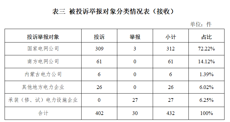 供電企業(yè)402件、占投訴舉報總數(shù)的93.75%,其中國家電網(wǎng)公司312件、占投訴舉報總數(shù)的72.22%,南方電網(wǎng)公司61件、占投訴舉報總數(shù)的14.12%,內(nèi)蒙古電力公司6件、占投訴舉報總數(shù)的1.39%,其他地方電力企業(yè)26件、占投訴舉報總數(shù)的6.02%;承裝(修、試)電力設(shè)施企業(yè)27件、占投訴舉報總數(shù)的6.25%。