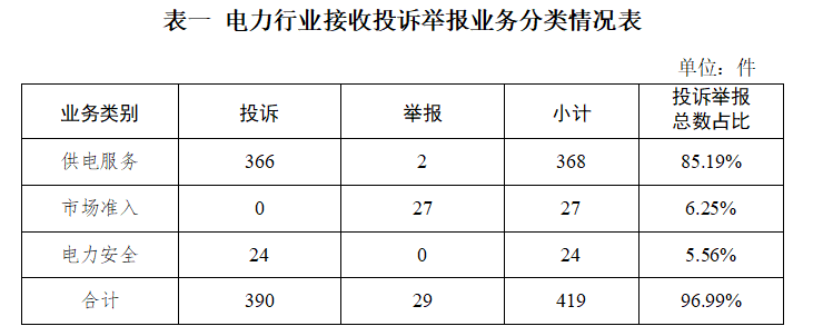 電力行業(yè)排在首位,數(shù)量為419件、占投訴舉報總數(shù)的96.99%,主要集中在供電服務(wù)、市場準入、電力安全等方面。