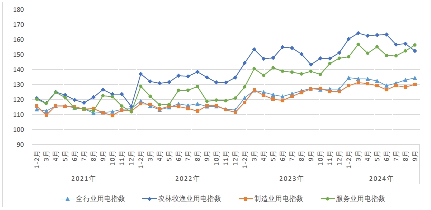 9月,農(nóng)林牧漁業(yè)用電指數(shù)為152.6,比2020年基期增長了52.6%,年均增長11.1%,同比增長6.4%,同比增速比上月回升1.8個百分點。