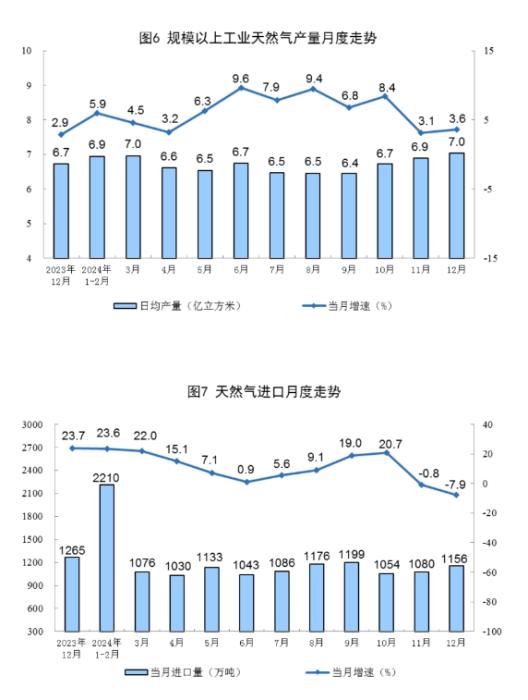 天然氣生產(chǎn)穩(wěn)步增長。12月份,規(guī)上工業(yè)天然氣產(chǎn)量218億立方米,同比增長3.6%,增速比11月份加快0.5個百分點;日均產(chǎn)量7.0億立方米。進口天然氣1156萬噸,同比下降7.9%。