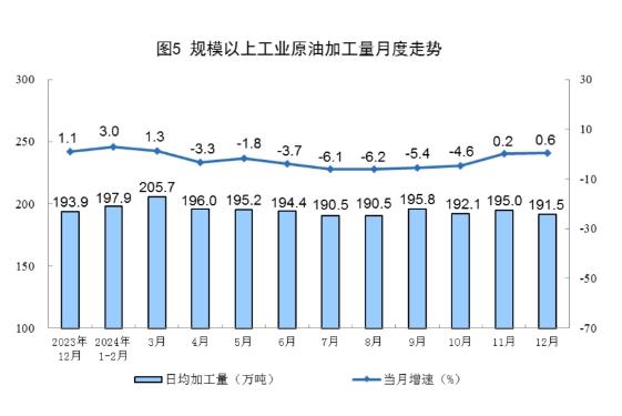 原油加工保持穩(wěn)定。12月份,規(guī)上工業(yè)原油加工量5935萬噸,同比增長0.6%,增速比11月份加快0.4個百分點;日均加工191.5萬噸。2024年,規(guī)上工業(yè)原油加工量70843萬噸,同比下降1.6%。