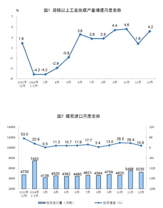 原煤生產(chǎn)增速加快。12月份,規(guī)上工業(yè)原煤產(chǎn)量4.4億噸,同比增長4.2%,增速比11月份加快2.4個百分點;日均產(chǎn)量1415.6萬噸。進口煤炭5235萬噸,同比增長10.9%。