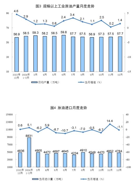 原油生產(chǎn)增速加快。12月份,規(guī)上工業(yè)原油產(chǎn)量1790萬噸,同比增長1.4%,增速比11月份加快1.2個百分點;日均產(chǎn)量57.7萬噸。進口原油4784萬噸,同比下降1.1%。