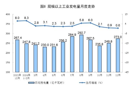 規(guī)上工業(yè)電力生產(chǎn)平穩(wěn)增長。12月份,規(guī)上工業(yè)發(fā)電量8462億千瓦時,同比增長0.6%;規(guī)上工業(yè)日均發(fā)電273.0億千瓦時。2024年,規(guī)上工業(yè)發(fā)電量94181億千瓦時,同比增長4.6%。