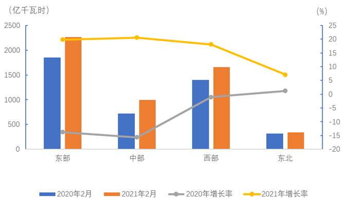1-2月,東、中、西部和東北地區(qū)②全社會用電量分別為5657、2407、3754和770億千瓦時(shí),增速分別為27.0%、20.8%、19.2%和10.0%。