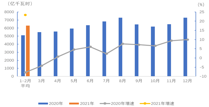 分產(chǎn)業(yè)看①,1-2月,第一產(chǎn)業(yè)用電量142億千瓦時(shí),同比增長26.5%;第二產(chǎn)業(yè)用電量8012億千瓦時(shí),同比增長25.8%;第三產(chǎn)業(yè)用電量2313億千瓦時(shí),同比增長22.5%;城鄉(xiāng)居民生活用電量2121億千瓦時(shí),同比增長10.0%