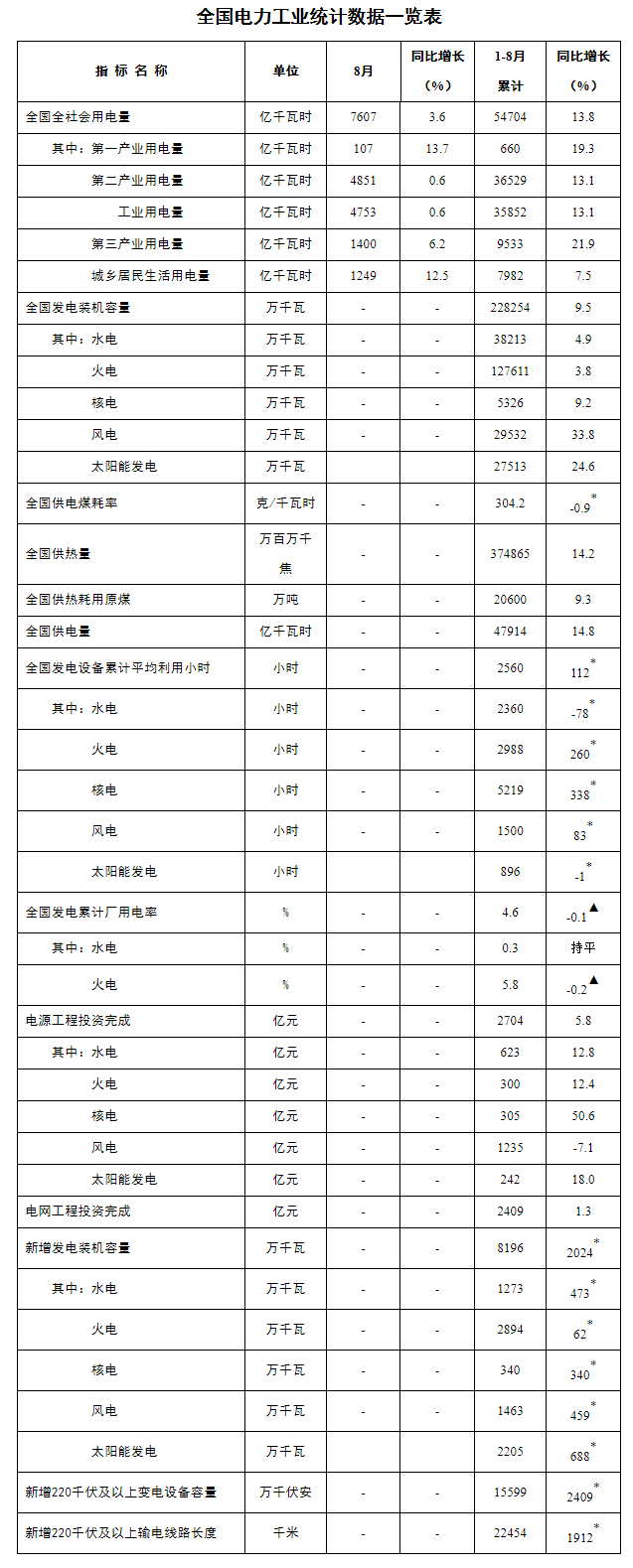 注:1.全社會(huì)用電量為全口徑數(shù)據(jù),全國供電量為調(diào)度口徑數(shù)據(jù)。2.“同比增長(zhǎng)”列中,標(biāo)*的指標(biāo)為絕對(duì)量;標(biāo)▲的指標(biāo)為百分點(diǎn)。