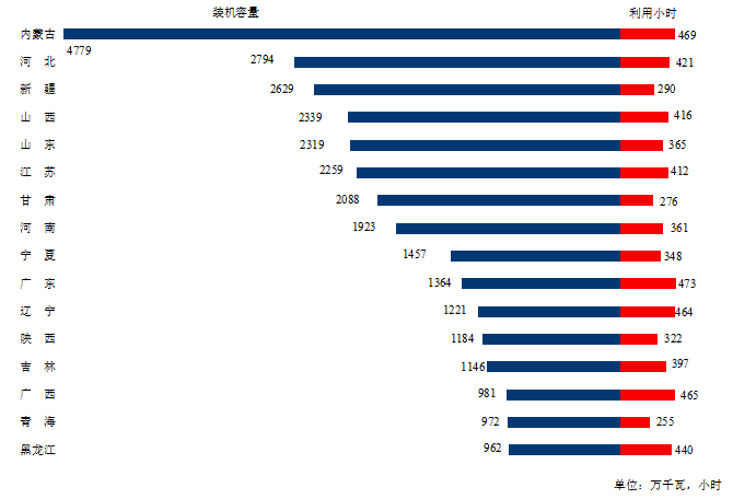 圖3 1-2月份風(fēng)電裝機(jī)較多省份風(fēng)電裝機(jī)容量和設(shè)備利用小時(shí)