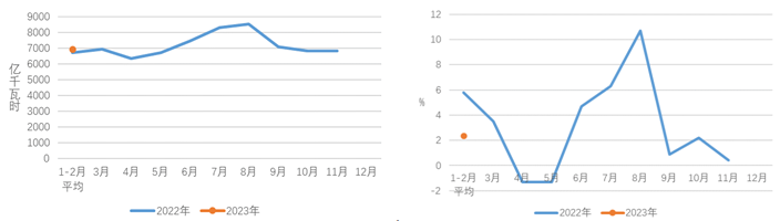 圖1 2022、2023年分月全社會用電量及其增速