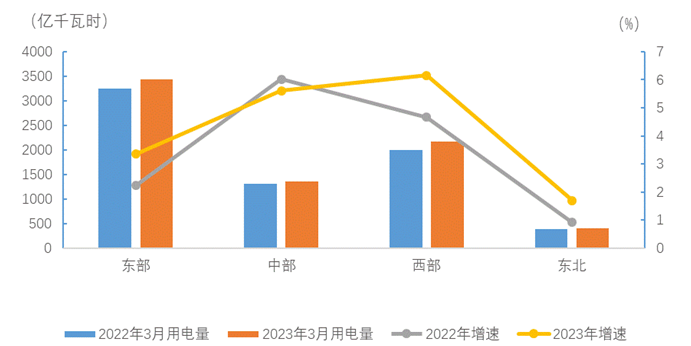 3月份,東、中、西部和東北地區(qū)全社會用電量增速分別為5.7%、4.3%、7.4%和5.4%。