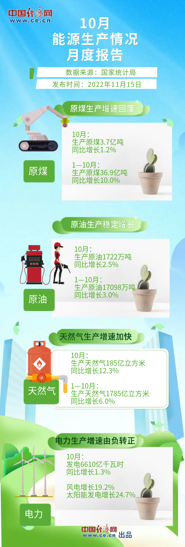 國(guó)家統(tǒng)計(jì)局發(fā)布能源生產(chǎn)情況月度報(bào)告。10月份,規(guī)模以上工業(yè)原煤、原油、天然氣和電力生產(chǎn)同比保持增長(zhǎng),其中,生產(chǎn)天然氣185億立方米,同比增長(zhǎng)12.3%,太陽(yáng)能發(fā)電增長(zhǎng)24.7%。1—10月份,生產(chǎn)原煤36.9億噸,同比增長(zhǎng)10.0%。