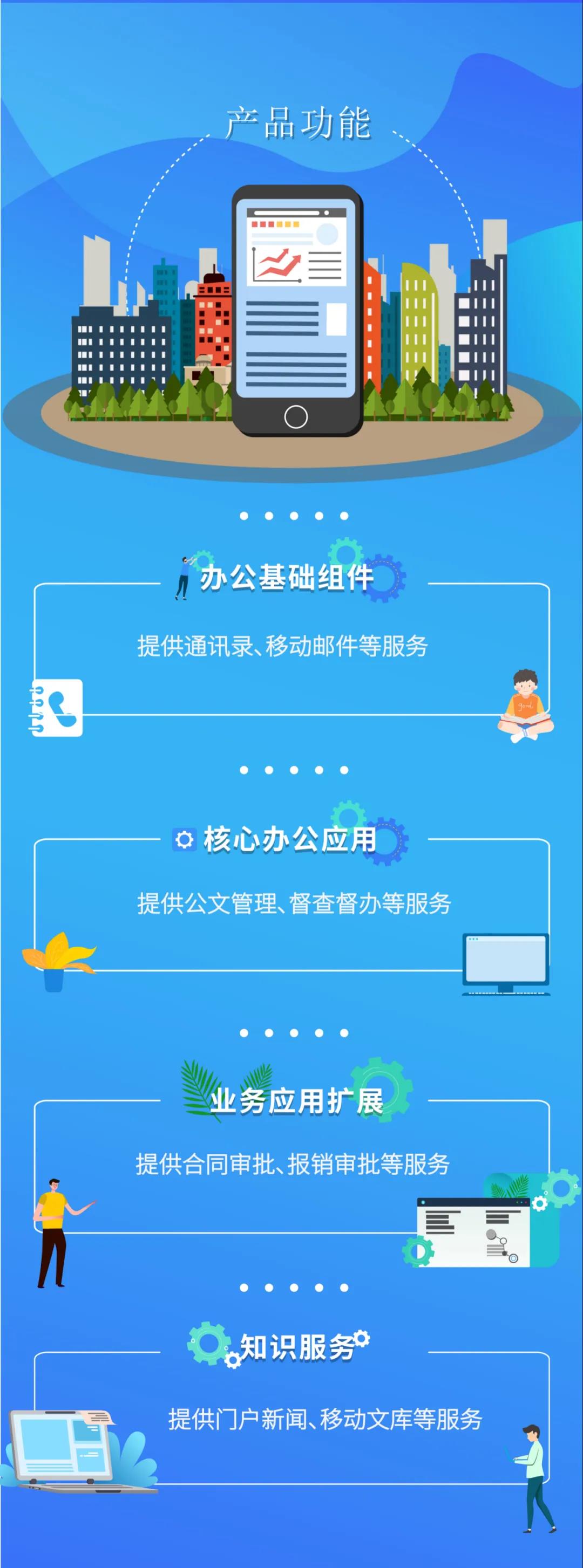 在公文、督辦、會議等核心辦公應(yīng)用功能的基礎(chǔ)上,實現(xiàn)了即時通訊、移動郵件、文檔協(xié)作、視頻會議、知識服務(wù)等基礎(chǔ)辦公服務(wù),為用戶提供豐富的移動業(yè)務(wù)應(yīng)用功能。