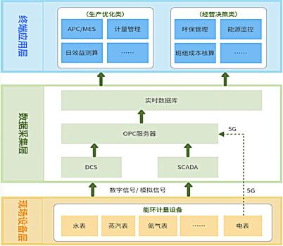 該體系主要由現(xiàn)場(chǎng)設(shè)備層、數(shù)據(jù)采集層、終端應(yīng)用層等組成。他們根據(jù)工藝與計(jì)量要求,先后配備了帶信號(hào)遠(yuǎn)傳功能、高準(zhǔn)確度等級(jí)的質(zhì)量流量計(jì)、電磁流量計(jì)、超聲波流量計(jì)等智能型計(jì)量?jī)x表,實(shí)現(xiàn)一、二級(jí)能源計(jì)量表配備率達(dá)100%。通過計(jì)量?jī)x表傳輸端采集能源計(jì)量數(shù)據(jù),上傳至DCS或SCADA系統(tǒng),再通過OPC接口上傳至實(shí)時(shí)數(shù)據(jù)庫(kù),采用5G無(wú)線傳輸技術(shù)解決偏遠(yuǎn)區(qū)域計(jì)量?jī)x表信號(hào)的數(shù)據(jù)采集與傳輸,最終為終端系統(tǒng)提供有效數(shù)據(jù)支持。