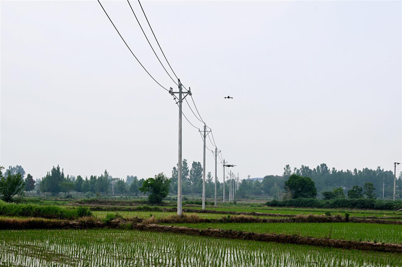 在湖北省安陸市木梓鎮(zhèn)10千伏江河線驗(yàn)收現(xiàn)場(chǎng),國(guó)網(wǎng)湖北電力利用無(wú)人機(jī)AI技術(shù)自主驗(yàn)收配電架空線路(余健兵、何瑤 攝)