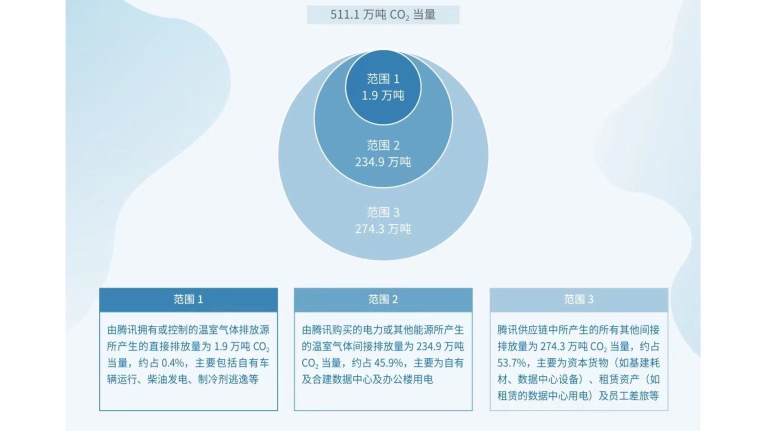 2021年,騰訊溫室氣體排放量總計(jì)511.1萬(wàn)噸。其中,公司擁有或控制的溫室氣體排放源所產(chǎn)生的直接排放量(即“范圍1”)、購(gòu)買的電力或其他能源所產(chǎn)生的間接排放量(即“范圍2”)分別為1.9萬(wàn)噸和234.9萬(wàn)噸;供應(yīng)鏈上下游產(chǎn)生的其他間接排放量(即“范圍3”)為274.3萬(wàn)噸。該結(jié)果是騰訊基于國(guó)際通行的碳減排范圍標(biāo)準(zhǔn)進(jìn)行的系統(tǒng)全面的碳盤查。
