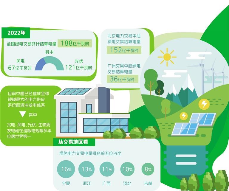 在政策推動(dòng)下,綠電交易規(guī)模進(jìn)一步擴(kuò)大。國(guó)網(wǎng)能源研究院數(shù)據(jù)顯示,2022年,全國(guó)綠電交易共計(jì)結(jié)算電量188億千瓦時(shí)。其中,風(fēng)電67億千瓦時(shí),光伏121億千瓦時(shí)。北京電力交易中心綠電交易結(jié)算電量152億千瓦時(shí),廣州交易中心綠電交易結(jié)算電量36億千瓦時(shí)。從交易地區(qū)看,綠色電力交易電量排名前五位的是寧夏、浙江、廣西、河北、吉林,占綠色電力交易總電量的16%、13%、11%、10%、8%。