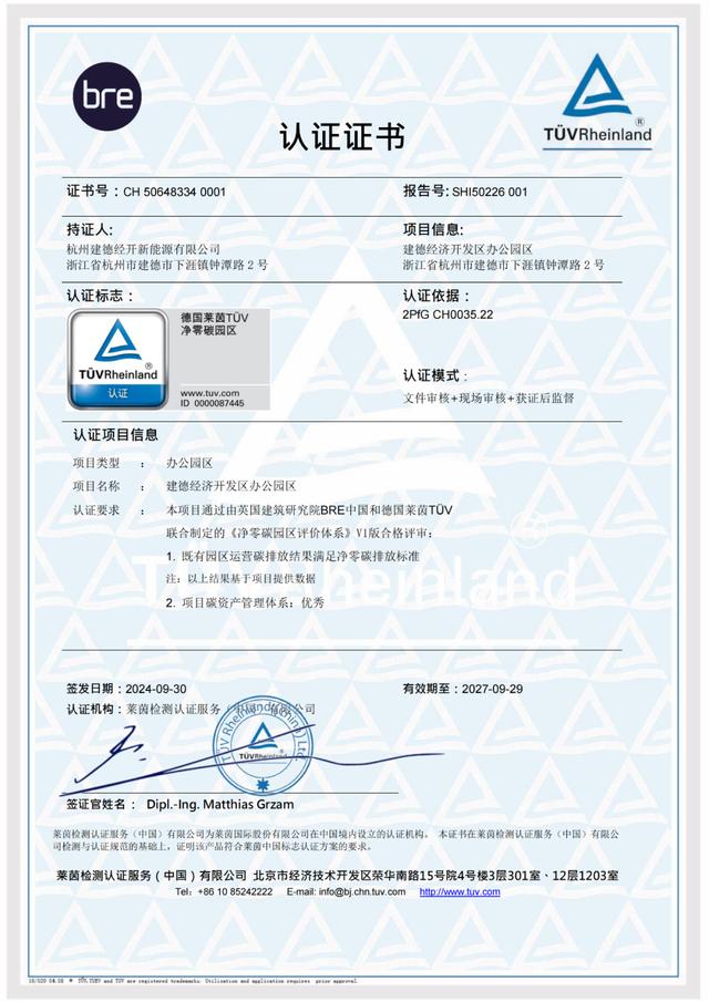 萬幫數(shù)字能源協(xié)助建德經(jīng)濟開發(fā)區(qū)辦公園區(qū)通過由英國建筑研究院BRE中國和德國萊茵TÜV 聯(lián)合制定的《凈零碳園區(qū)評價體系》V1版合格評審,并獲項目碳資產(chǎn)管理體系優(yōu)秀級評價。