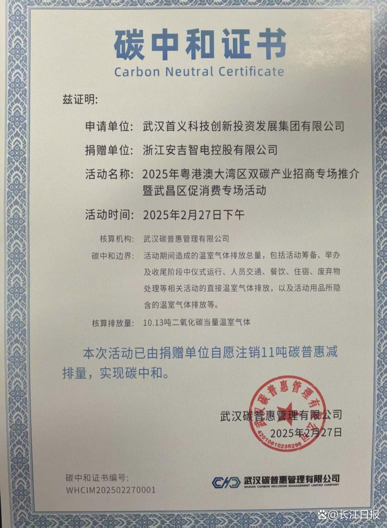 湖北碳交中心為大會頒發(fā)的碳中和證書。