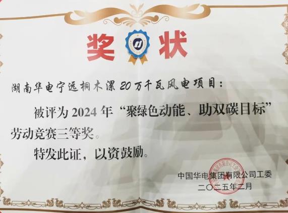 從《關(guān)于表彰2024年“聚綠色動能、助雙碳目標(biāo)”打通“堵點”專項勞動競賽先進(jìn)集體和個人的決定》(中國華電工委〔2025〕37號)中獲悉,公司所屬桐木漯20萬千瓦風(fēng)電項目榮獲2024年集團(tuán)公司“聚綠色動能、助雙碳目標(biāo)”勞動競賽三等獎。新能湖南分公司工程建設(shè)部(物資部)主任賀亮平榮獲2024年集團(tuán)公司“聚綠色動能、助雙碳目標(biāo)”勞動競賽打通“堵點”能手榮譽(yù)稱號。