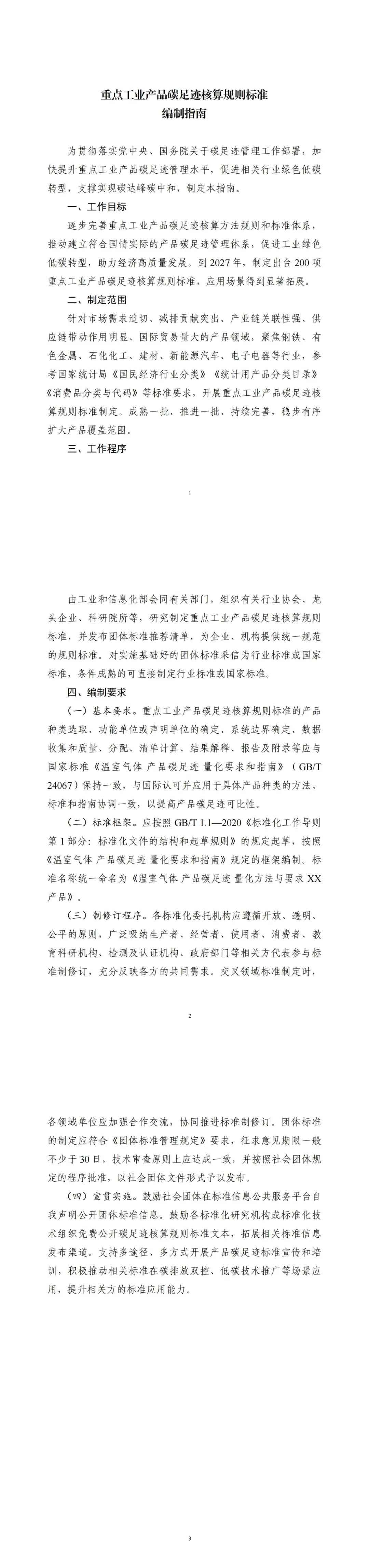 為貫徹落實黨中央、國務院關于碳足跡管理工作部署,加快提升重點工業(yè)產(chǎn)品碳足跡管理水平,促進相關行業(yè)綠色低碳轉型,支撐實現(xiàn)碳達峰碳中和,特制定《重點工業(yè)產(chǎn)品碳足跡核算規(guī)則標準編制指南》,請遵照執(zhí)行。