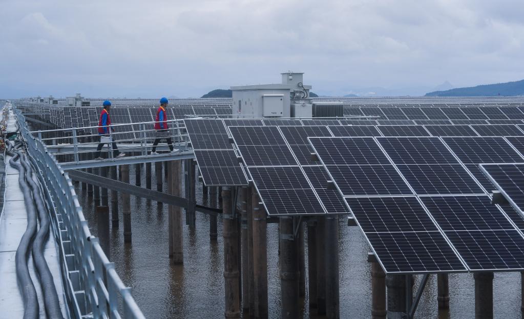 6月29日,國網(wǎng)浙江象山縣供電公司工作人員正在巡檢象山長大涂灘涂光伏設(shè)備。新華社記者 徐昱 攝