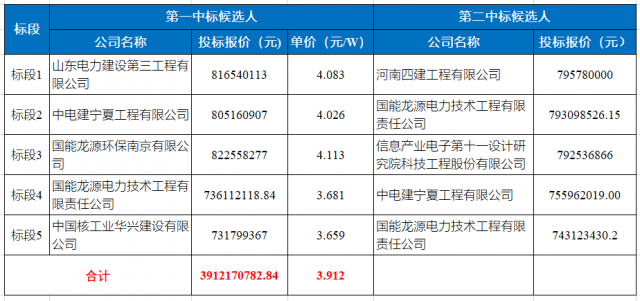 “寧湘直流”配套新能源基地中衛(wèi)3GW一期1GW,5個(gè)標(biāo)段的開標(biāo)結(jié)果如下表所示。