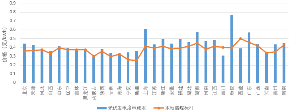 采用2019年各省光伏發(fā)電實際利用小時數(shù),計算了各省光伏發(fā)電的度電成本,與各省燃煤標桿電價的對比如圖2所示。位于東北或西部地區(qū)的吉林、黑龍江、四川、青海、西藏、內(nèi)蒙古的度電成本已經(jīng)低于本省(區(qū))燃煤標桿電價。另外,有8個省(區(qū)、市)的光伏度電成本高于燃煤基準電價不足10%,也將很快實現(xiàn)平價。需要說明的是,雖然一些省份光伏發(fā)電度電成本在全國已經(jīng)處于較低水平,但是與當?shù)厝济簶藯U電價相比仍然沒有實現(xiàn)平價。