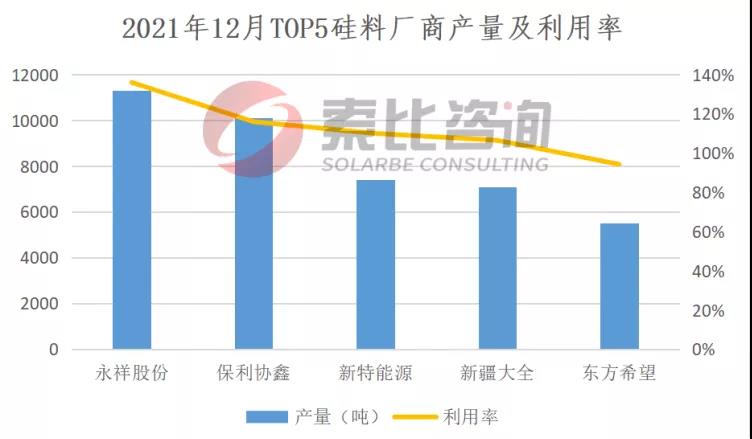 根據(jù)索比咨詢統(tǒng)計(jì),2021年12月,前五大硅料企業(yè)總產(chǎn)量4.14萬(wàn)噸,綜合產(chǎn)能利用率112.6%。硅片方面,兩家頭部企業(yè)開工率回至50%以上,一體化企業(yè)開工率相對(duì)較高。去年12月,國(guó)內(nèi)硅片產(chǎn)量17.85GW,環(huán)比下降8.6%。按照產(chǎn)量排名,隆基、晶科、中環(huán)、上機(jī)、晶澳位列前五,總產(chǎn)量12.35GW,占比69.19%,綜合利用率67.81%。雖然有觀點(diǎn)認(rèn)為,中環(huán)的實(shí)際產(chǎn)能利用率要高于上述數(shù)據(jù),但總體看,產(chǎn)業(yè)鏈上游價(jià)格居高不下,已經(jīng)影響到終端需求,并反作用于上游。