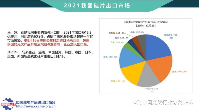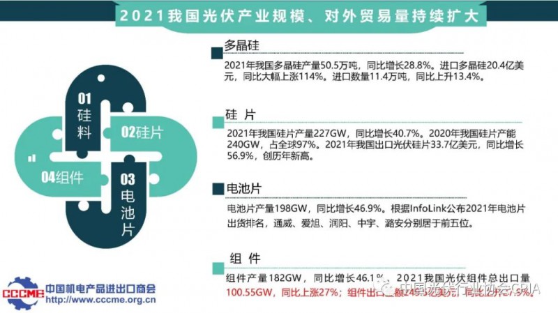 中國(guó)機(jī)電產(chǎn)品進(jìn)出口商會(huì)光伏分會(huì)秘書長(zhǎng)張森介紹光伏產(chǎn)品國(guó)際貿(mào)易情況。2021年我國(guó)光伏產(chǎn)業(yè)規(guī)模、對(duì)外貿(mào)易量持續(xù)擴(kuò)大,行業(yè)發(fā)展主要痛點(diǎn)是光伏貿(mào)易摩擦再次升級(jí)、海運(yùn)費(fèi)和匯率大幅上漲等。