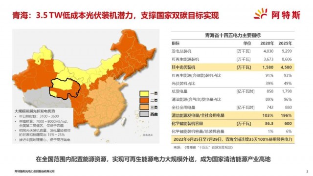 青海具有大規(guī)模發(fā)展光伏獨(dú)特的資源和區(qū)位優(yōu)勢,首先土地資源豐富,同時陽光燦爛,年日照時數(shù)3100~3600小時,年輻射量7,000~8,000 MJ/m2,位居全國第二位,僅低于西藏,相同光伏裝機(jī)容量,發(fā)電量較相鄰的甘肅和新疆高出15%~25%;青海接近中國地理中心,便于電力外送;全省光伏裝機(jī)資源潛力3.5TW,是目前全國光伏裝機(jī)總?cè)萘康氖抖?,光伏發(fā)電前景廣闊,是我國實(shí)現(xiàn)雙碳目標(biāo)重要的資源支撐。