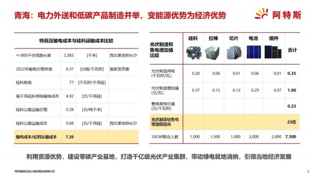 以前,在建設(shè)燃煤電站時,要做的經(jīng)濟(jì)分析是對比運(yùn)煤和輸電成本。而我們今天在青海要做的是輸電和把電力就地轉(zhuǎn)化成產(chǎn)品的成本對比分析。在青海建設(shè)附加值高、技術(shù)和用能密集的多晶硅料,然后把部分多晶硅料就地加工成碳足跡低的綠色光伏組件產(chǎn)品,另一部分硅料運(yùn)輸?shù)侥茉炊倘笔》菔褂谩?jù)國家發(fā)改委新近發(fā)布的三條特高壓線路的輸電價格,我們測算硅料運(yùn)輸?shù)某杀静患拜旊姵杀镜?/7。