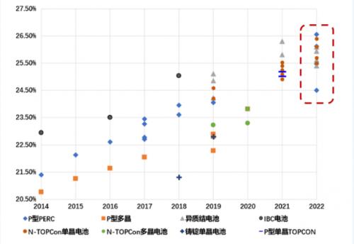 在內外部環(huán)境的共同推動下,我國光伏企業(yè)加大工藝技術研發(fā)力度,生產工藝水平不斷進步,不斷刷新紀錄。據中國光伏行業(yè)協會統計,2014—2022年,我國企業(yè)、研究機構晶硅電池實驗室效率共打破世界紀錄56次;2022年,刷新效率紀錄14次,其中10次為n型電池技術。未來隨著生產成本的降低及良率的提升,n型電池將會成為電池技術的主要發(fā)展方向之一。