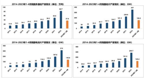 2022年,我國多晶硅產量85.7萬噸,連續(xù)十二年位居世界首位,占全球產量的85.6%;國內硅片產量371.3GW,占全球產量的97.4%;國內電池片產量約330.6GW,同比增長67.1%,占全球產量的90.3%;國內組件產量約294.7GW,同比增長62.1%,占全球產量的84.8%。