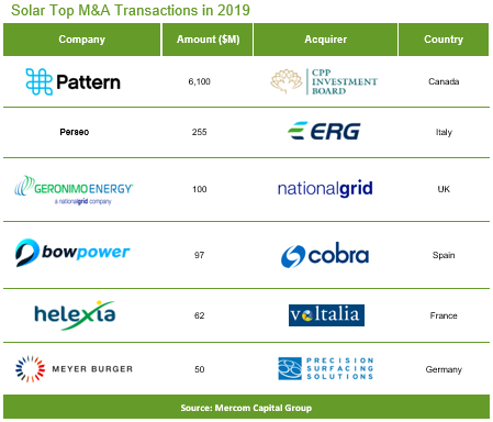 2019年,太陽能領(lǐng)域有65項(xiàng)并購交易,而2018年為82宗。大多數(shù)交易涉及太陽能下游企業(yè)。2019年,BayWa,EDF可再生能源和Engie均收購了兩家公司。 2019年最大的一筆交易是加拿大退休金計(jì)劃投資委員會(huì)(CPPIB)以61億美元收購Pattern Energy的交易。
