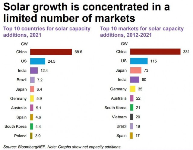 2021年太陽能新增容量排名前十的國家占整個市場的85%,過去十年也有類似的趨勢,2012-2021年間的新增容量占全部容量的80%。