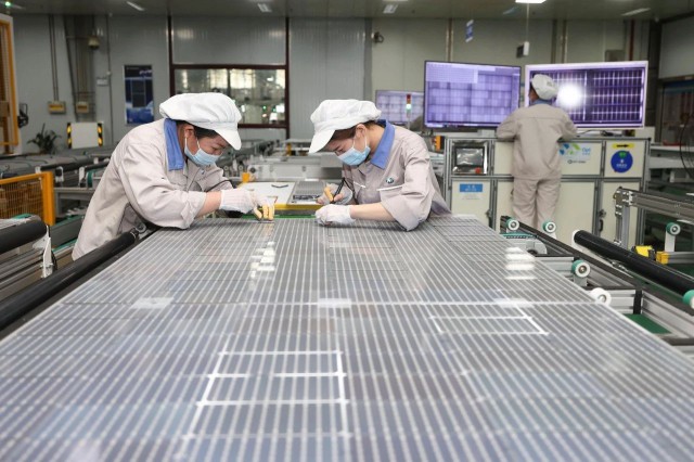 ▲江蘇省連云港市,工人們正在生產(chǎn)用于出口的太陽能光伏板。圖片來源:Cynthia Lee / Alamy