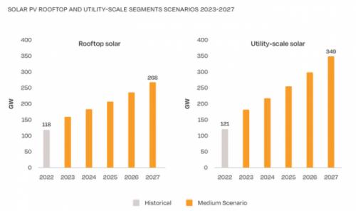 歐洲光伏產(chǎn)業(yè)協(xié)會預(yù)測,到2023年,全球安裝的屋頂光伏系統(tǒng)裝機容量將增長35%,預(yù)計增加到159GW。根據(jù)中期情景,到2024年,這一數(shù)字可能上升到183GW,到2027年可能達(dá)到268GW。與2022年相比,這一增長將更加穩(wěn)定,因為這將受到能源價格回歸較低水平的推動。