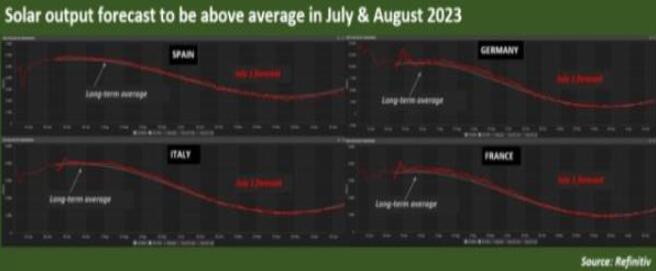 Refinitiv(路孚特,倫敦證券交易所集團旗下企業(yè),是全球最大的金融市場數(shù)據(jù)和基礎(chǔ)設(shè)施提供商之一)對國家級太陽能產(chǎn)量的預(yù)測顯示,西班牙、德國、法國和意大利的產(chǎn)量將遠高于長期平均水平——所有主要太陽能生產(chǎn)國最近幾周都經(jīng)歷了持續(xù)炎熱的天氣。