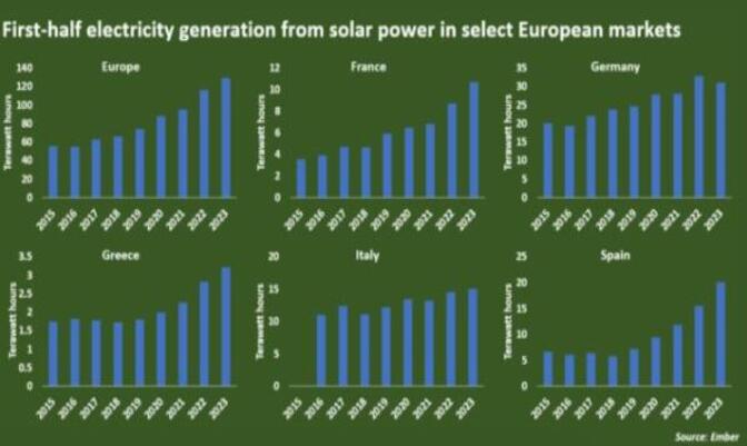 據(jù) Ember(Ember是一個獨立能源智庫,旨在通過數(shù)據(jù)和分析,推動世界向清潔電力轉(zhuǎn)型。) 稱,今年上半年歐洲太陽能發(fā)電量較 2022年同期,增長了近 11%,達到創(chuàng)紀(jì)錄的 129.2 太瓦時。