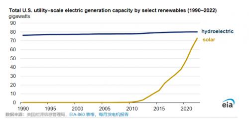 投資稅收抵免等激勵(lì)措施鼓勵(lì)了可再生能源發(fā)電能力的增長(zhǎng)。截至2023年8月,美國(guó)太陽能裝機(jī)容量總計(jì)超過125吉瓦(GW),其中包括80吉瓦的公用事業(yè)規(guī)模太陽能容量和估計(jì)45吉瓦的小型太陽能容量。過去幾十年來,美國(guó)的水力發(fā)電容量相對(duì)穩(wěn)定地保持在80吉瓦左右。