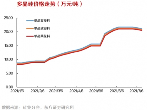 或許是在大擴產(chǎn)的預(yù)期下,近期硅料普遍價格由大漲轉(zhuǎn)向松動。根據(jù)硅業(yè)分會數(shù)據(jù),上周國內(nèi)單晶復(fù)投料成交均價下滑至 20.81 萬元/噸,周環(huán)比降幅為 1.61%;單晶致密料成交均價下滑至 20.6 萬元/噸,周環(huán)比降幅為 1.06%;單晶菜花料成交均價下滑至 20.35 萬元/噸,周環(huán)比降幅 0.73%。