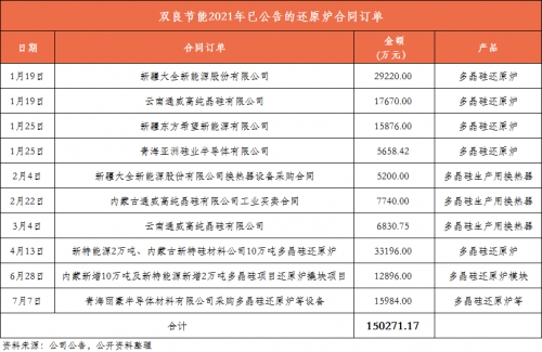 與此同時,國內(nèi)多晶硅還原爐市占率第一、該細分領(lǐng)域絕對龍頭的雙良節(jié)能也受益頗豐(還原爐是生產(chǎn)多晶硅的重要設(shè)備),近三年來累計為行業(yè)各家硅料企業(yè)提供三百多臺大型高效還原爐。據(jù)公告統(tǒng)計,2021年以來公司已簽訂的多晶硅還原爐項目已高達15.02億元,相比2020全年多晶硅還原爐系統(tǒng)實現(xiàn)的1.77億元收入,大幅增長748.59%。