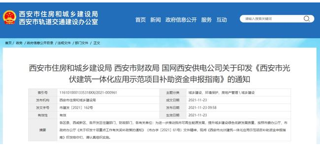 11月23日,西安市住房和城鄉(xiāng)建設(shè)局,西安市財政局,國網(wǎng)西安供電公司印發(fā)了《西安市光伏建筑一體化應(yīng)用示范項目補助資金申報指南》的通知。實施年限為2021~2023年。