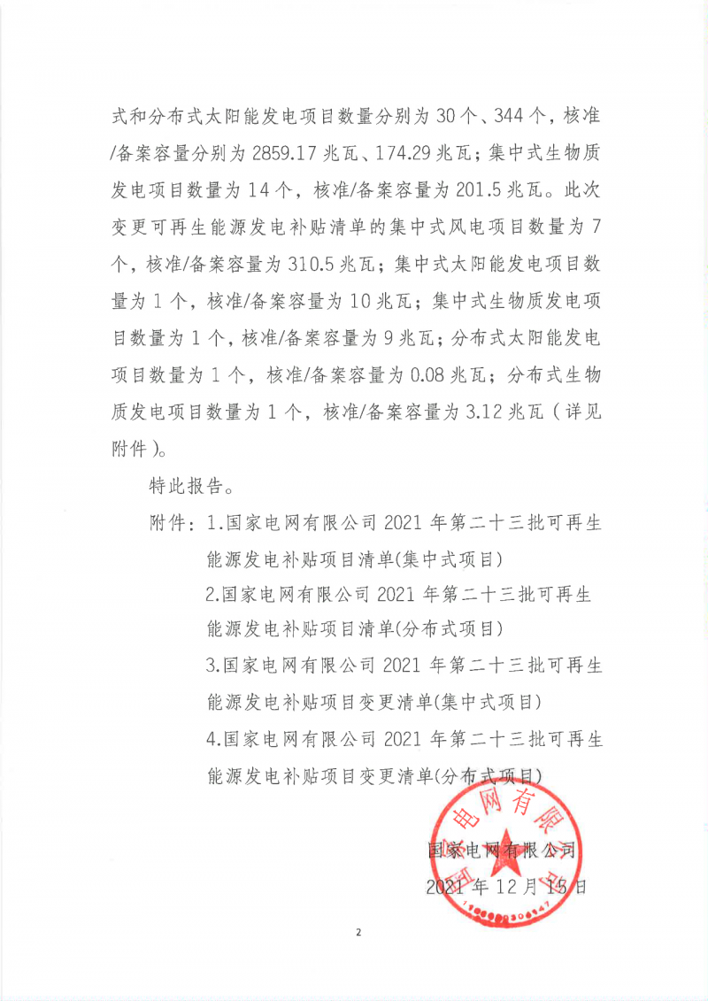 2021年12月15日,我公司已將完成公示的2021年第二十三批可再生能源發(fā)電項目補貼項目清單上報國家主管部門,已公布項目清單及后續(xù)項目審核進展情況,請登錄新能源云平臺查詢。