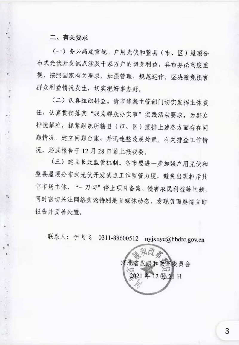 12月21日,河北省發(fā)改委下發(fā)《關(guān)于開(kāi)展戶(hù)用光伏和整縣(市、區(qū))屋頂分布式光伏開(kāi)發(fā)試點(diǎn)工作問(wèn)題排查的緊急通知》,文件指出:近期有關(guān)媒體報(bào)道多起有關(guān)戶(hù)用光伏和整縣(市、區(qū))屋頂分布式光伏開(kāi)發(fā)試點(diǎn)工作損害群眾利益的事件,引發(fā)社會(huì)輿論高度關(guān)注。按照國(guó)家發(fā)展改革委、國(guó)家能源局安排部署,為進(jìn)一步規(guī)范戶(hù)用光伏和整縣(市、區(qū))屋頂分布式光伏開(kāi)發(fā)試點(diǎn)工作,開(kāi)展問(wèn)題排查工作。有關(guān)排查工作情況,于12月28日上報(bào)。