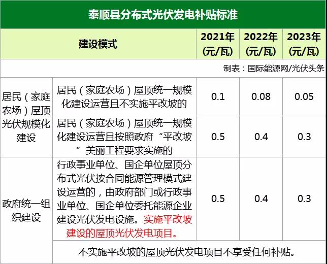 居民(家庭農(nóng)場(chǎng))屋頂統(tǒng)一規(guī)?;ㄔO(shè)運(yùn)營(yíng)且按照政府“平改坡”美麗工程要求實(shí)施的,在光伏發(fā)電項(xiàng)目建成、并網(wǎng)和驗(yàn)收后給予居民發(fā)放一次性平改坡建設(shè)補(bǔ)貼。2021年、2022年、2023年建成、并網(wǎng)和驗(yàn)收的實(shí)行差異化補(bǔ)貼,補(bǔ)貼標(biāo)準(zhǔn)分別為0.5元/瓦、0.4元/瓦、0.3元/瓦。